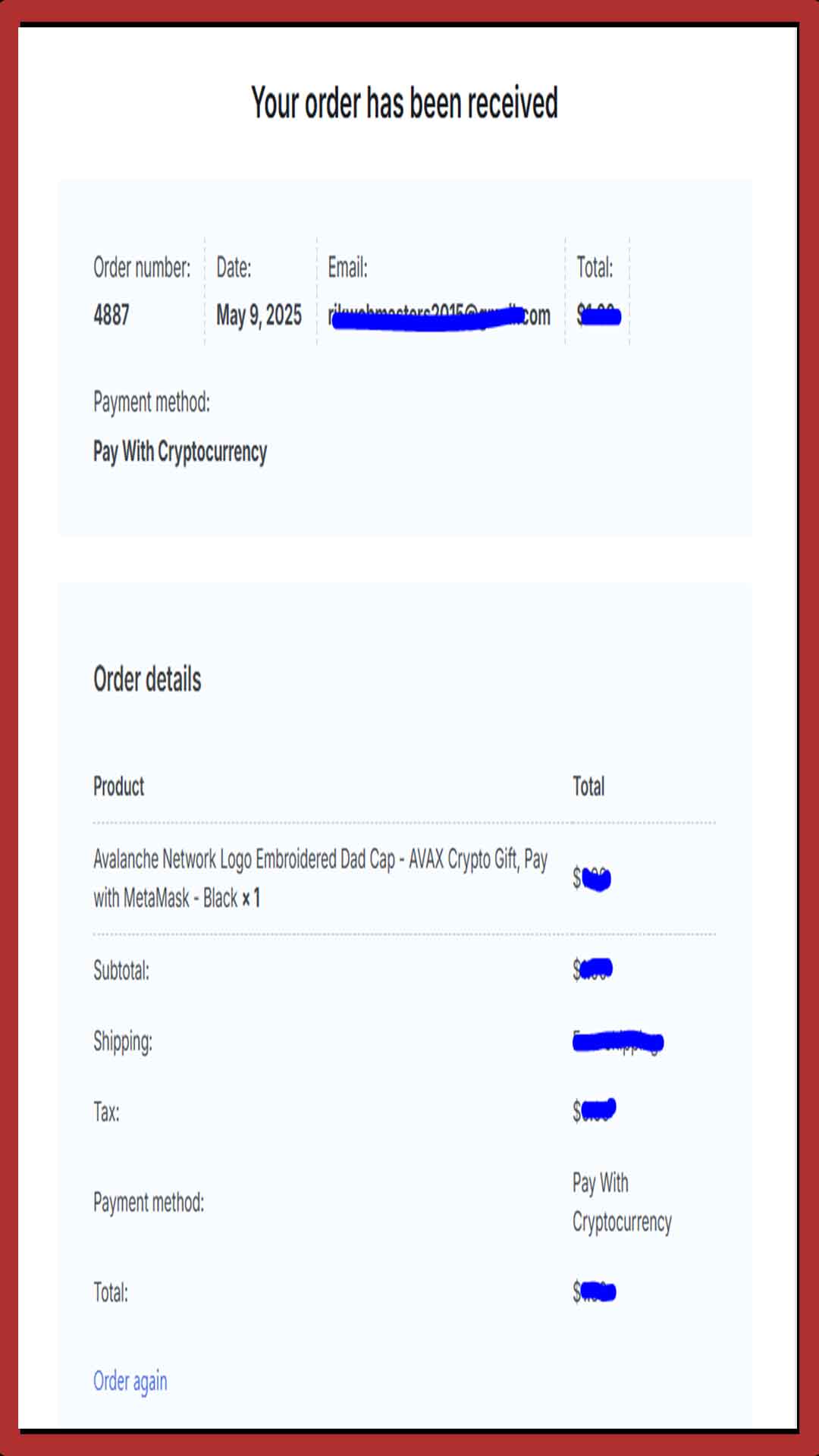 - After clicking Pay with Crypto,Your MetaMask extension/app will pop up.Review the order total (in ETH, USDC, or other supported tokens) and gas fees.Log in to MetaMask and connect to chosenandlove.shop by approving the connection.